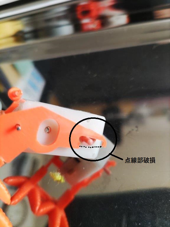 (3)回転を横の動きに変換する機構部(点線部)が折れていたので、針金で補強した