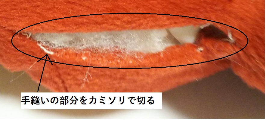 縫いぐるみの修理では、布の部分の縫い合わせをほどかないと内部状態を確認できない場合が多い。