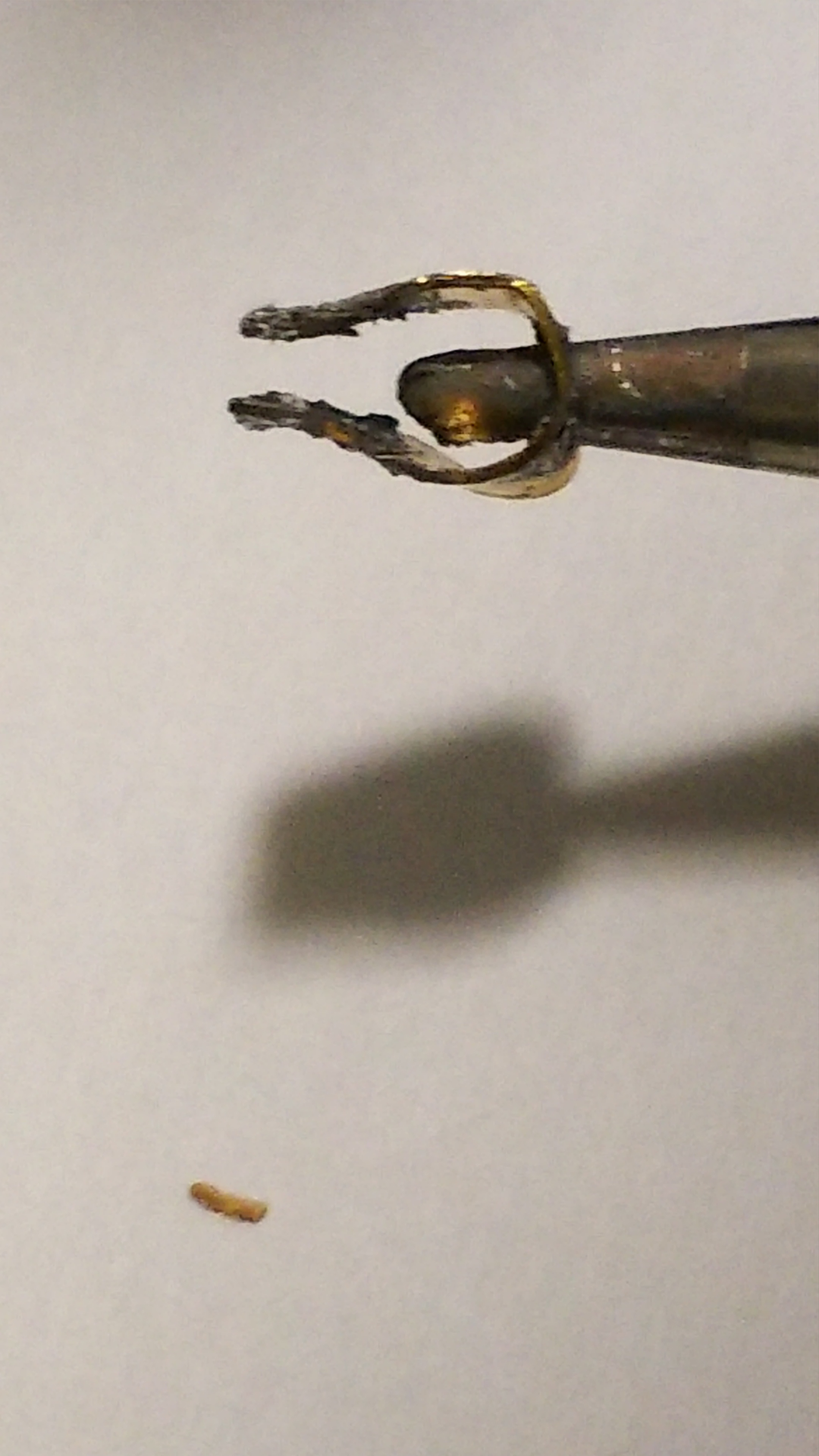 部品は治具にはさんだ状態で取れますので、手早くこて先から落とします。加熱しすぎると部品が壊れます