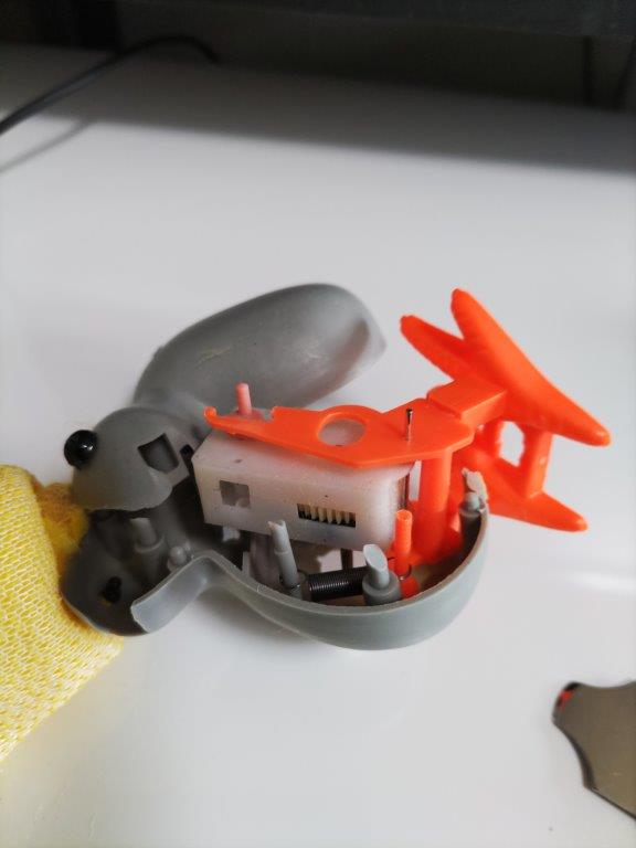 (1)まずは解体。布(毛皮)の接着部をカッターなどではがし解体する。