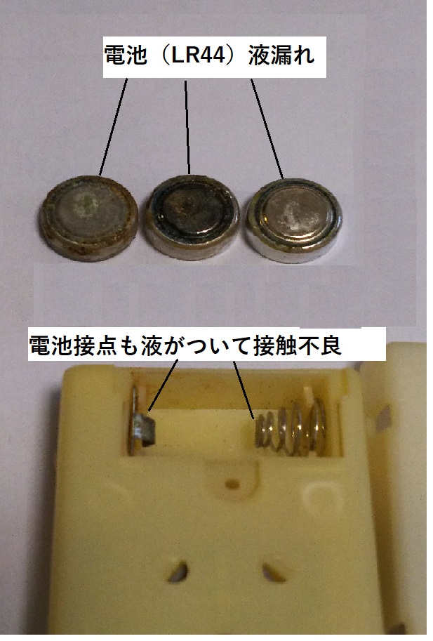アルカリボタン電池LR44(AG13)が液漏れし、漏れた液が電池接点を腐食。