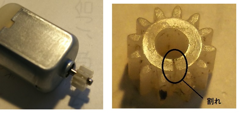 ピニオンギアが割れるとモータ軸が空回りして、ギアに力が伝わらない。 ピニオンギアは、モータや減速ギアとしても使われている
